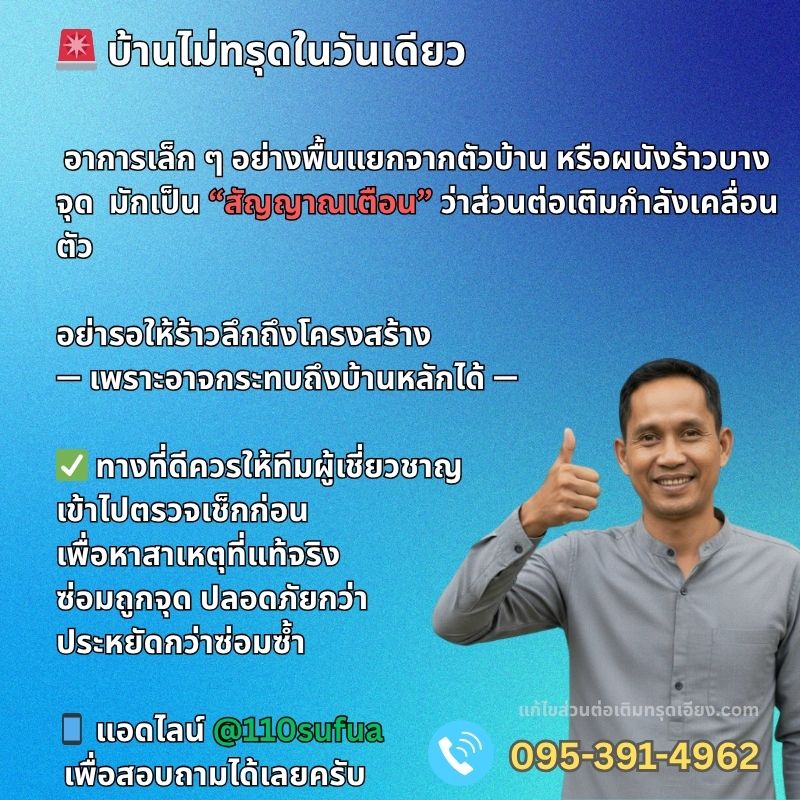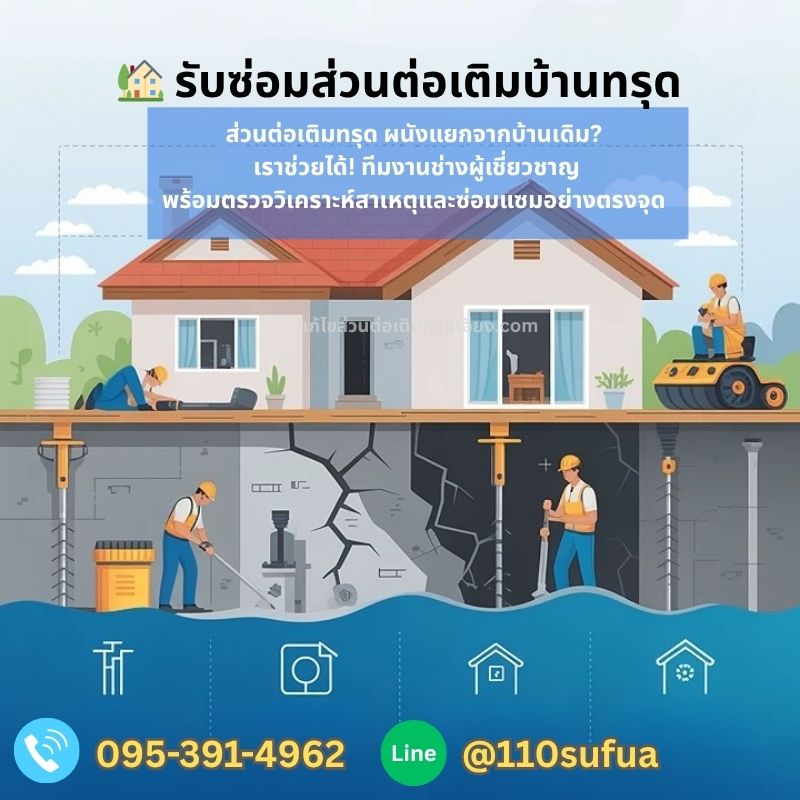 การแก้ไขส่วนต่อเติมบ้านทรุดเอียง ควรดำเนินการโดยช่างผู้ชำนาญการ และควบคุมงานโดยวิศวกรผู้เชี่ยวชาญ
