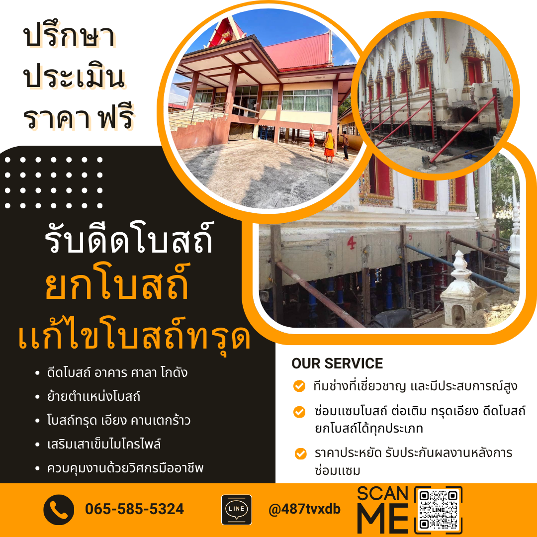 บริการของเราครอบคลุมการแก้ไข รั้ว อาคาร ศาลา ครัวทรุดเอียง พื้นโกดัง หรือจะต่อเติมบ้านทรุดเอียง ดีดโบสถ์ยกโบสถ์ เราเเก้ไขได้ โดยเน้นความปลอดภัย ความทนทาน และความสวยงาม ทำให้คุณมั่นใจได้ว่าการซ่อมแซมของคุณจะมีความสมบูรณ์แบบทั้งด้านฟังก์ชันและการออกแบบ